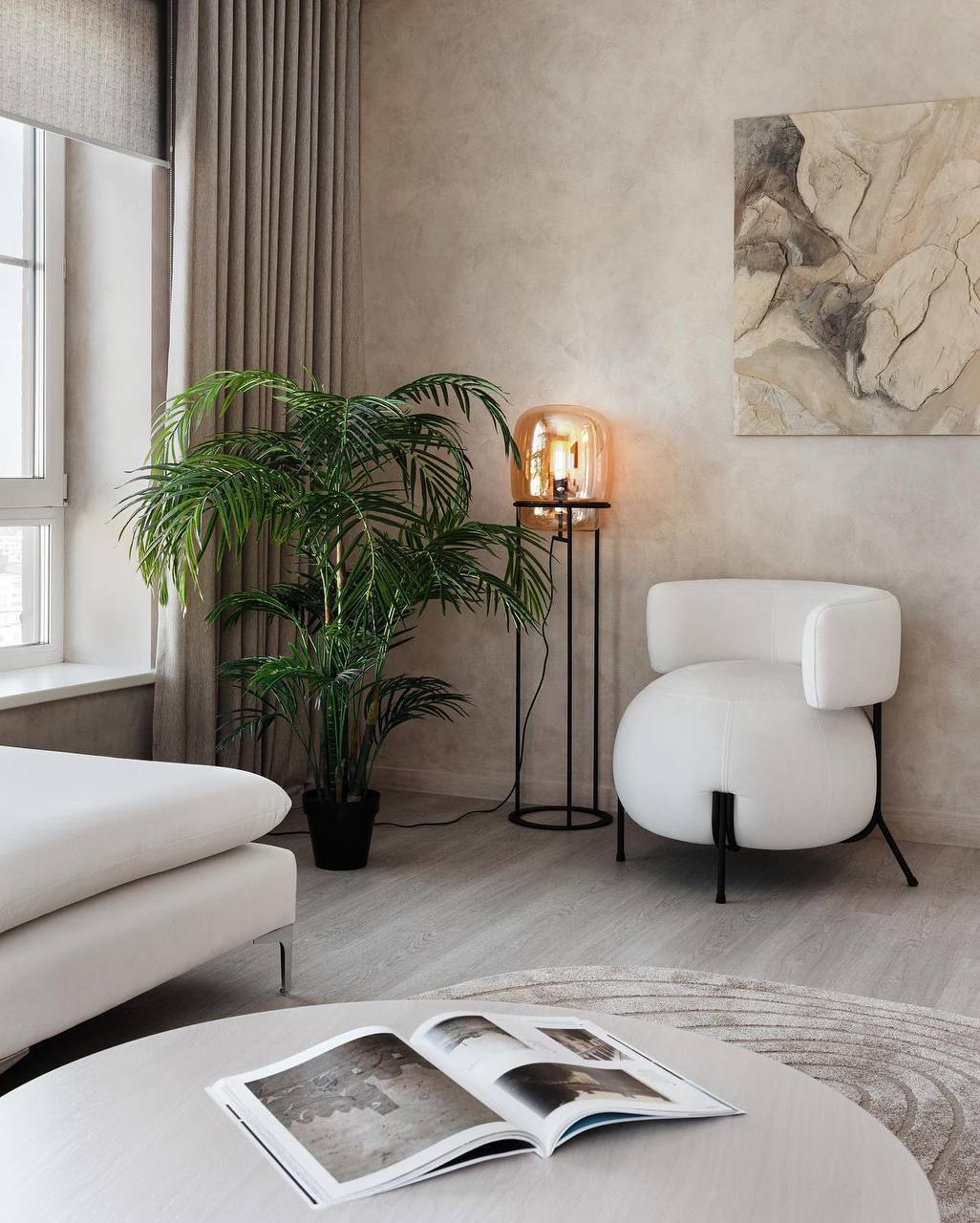 Контраст света и тени: Покрытие реагирует на освещение: при разных углах падающего света появляются мягкие светлые и глубокие тёмные переливы. Это делает интерьер более живым, динамичным и уютным.