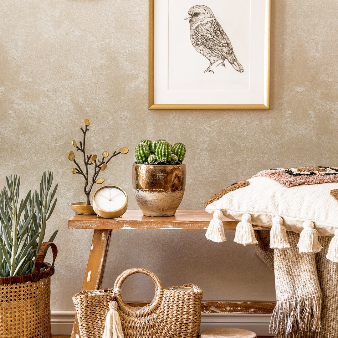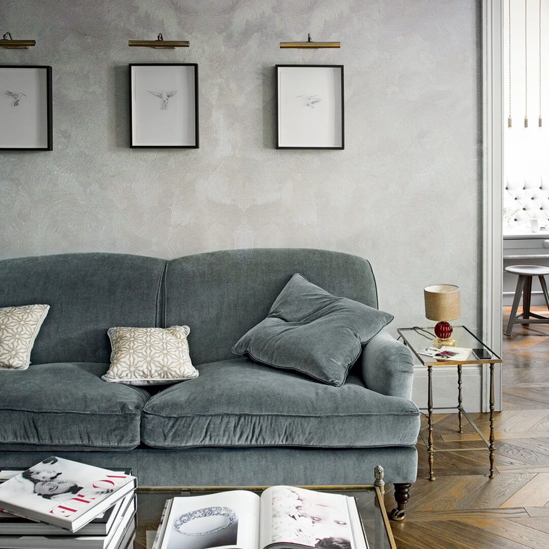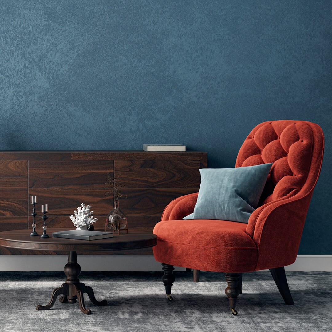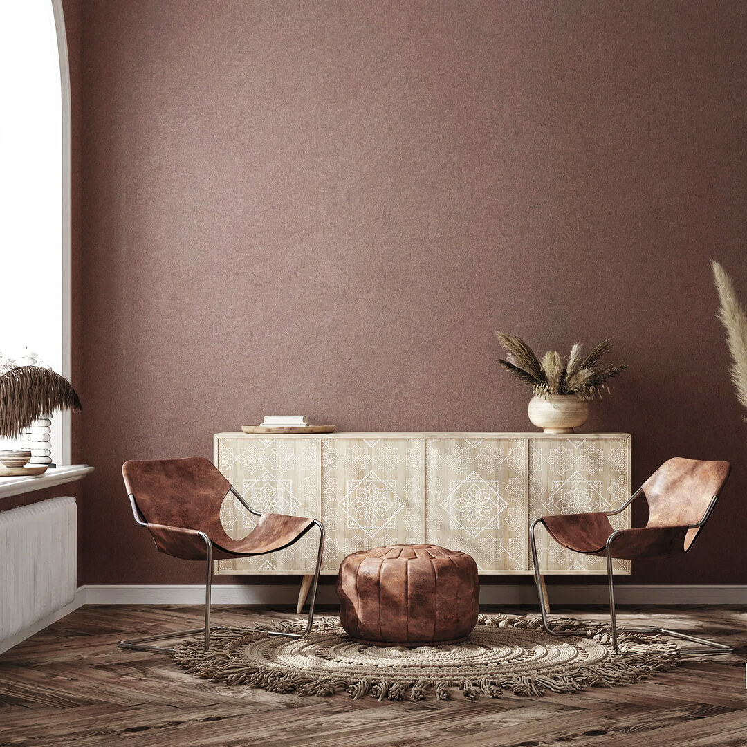 Эффект состаренных стен: Мягко размытые переходы оттенков создают ощущение, что стены насыщены временем. Покрытие придаёт интерьеру атмосферу уюта, тепла и художественной естественности.